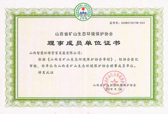 山西省礦山生態(tài)環(huán)境保護(hù)協(xié)會理事成員單位證書
